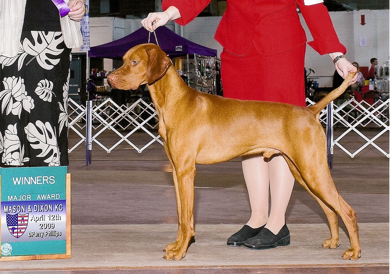 | Ch. Szep-N-Tivoliz Puttin' On The Ritz, aka Cooper is the adoring son of the Desmarais household. Never to replace their beloved Lisa, Cooper takes his job of "velcro vizsla" quite seriously and was quick to fill the void and ease the heartaches left by Lisa's pawprints. A best friend and constant companion to mom-Kelly, Cooper is still a daddy's boy with ample love to share. Although Cooper is an Owe'n son by breeding and has the famed tell-tale tail wag, he has grown into the spitting image of his grandfather Jaeger - from his old-style head and easy movement to his classic "I want" and "don't leave me" whine. Cooper wears many hats: he is the occasional show dog, a tried and true baby sitter (for human and canine alike), and a tolerant older brother to his sweetly domineering sister, Echo. But no matter what Cooper is up to, he is a classic Vizsla boy; he's just happy to be doing whatever he is doing. |